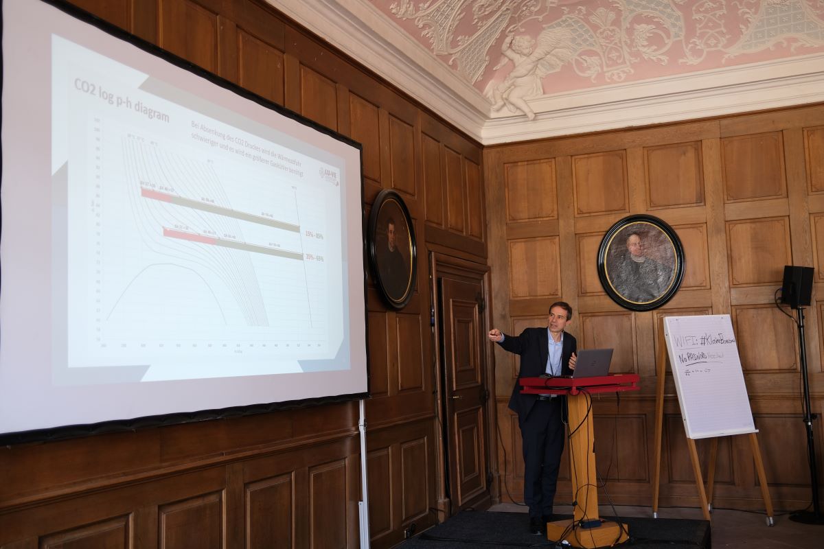 Technischer wurde Stefano mit dem Thema "CO2: Thermodynamische Grundlagen". Er erläuterte den Einfluss der Thermodynamik auf die Lebensmittelqualität, den Einfluss des CO2-Drucks und die Eurovent-Richtlinien für die Dimensionierung von Gaskühlern. Beim Thema Wärmeleistung und CO2-Druck im Gaskühler verglich Stefano eine zertifizierte mit einer nicht zertifizierten Anlage. Dies war nur eine Aufwärmübung für den nächsten Teil seines Vortrags, in dem er uns durch eine CO2-Simulation führte.