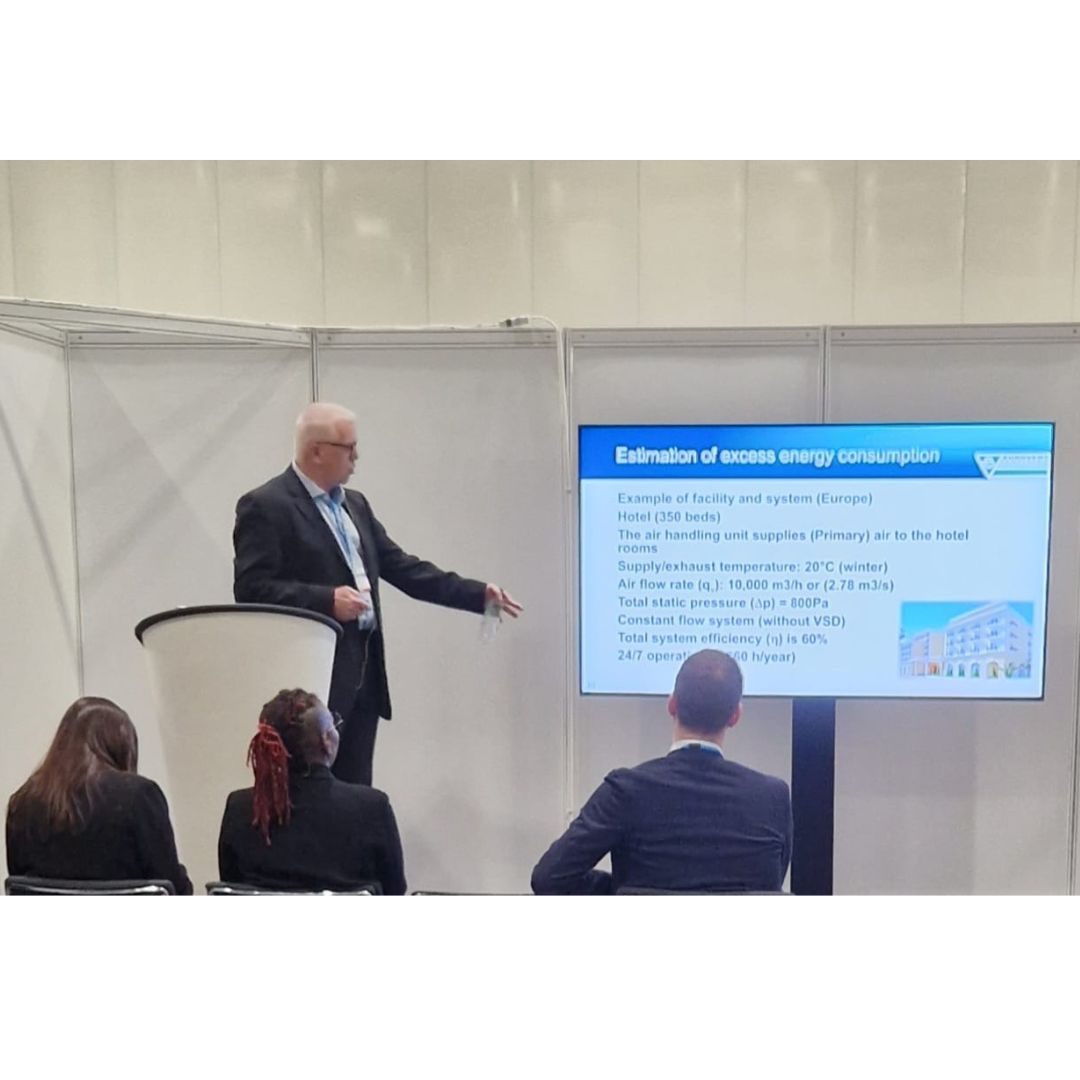 On day one, Ian Butler took to the conference theatre to present, ‘Reliability of air handling unit declared data vs. actual energy consumption’. The seminar began by exploring the three global crises impacting the UK industry, including the energy crisis, climate change and inflation. Introducing the importance of reducing energy consumption, emissions and cost, Ian then went on to discuss the impact that Air Handling Units (AHUs) have on the energy consumption of buildings.