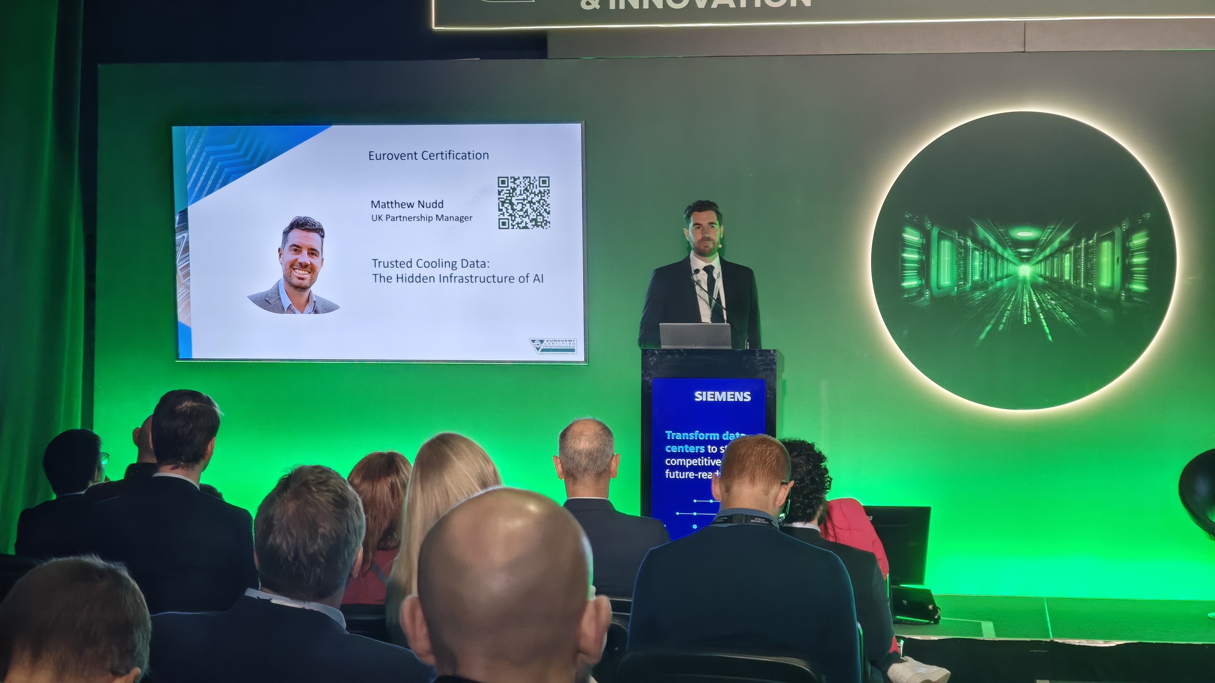 The action then moved to the prestigious keynote theatre. Taking to the stage, Matthew Nudd, UK Partnership Manager at Eurovent Certification delivered a compelling talk on “Trusted Cooling Data: The Hidden Infrastructure of AI.”