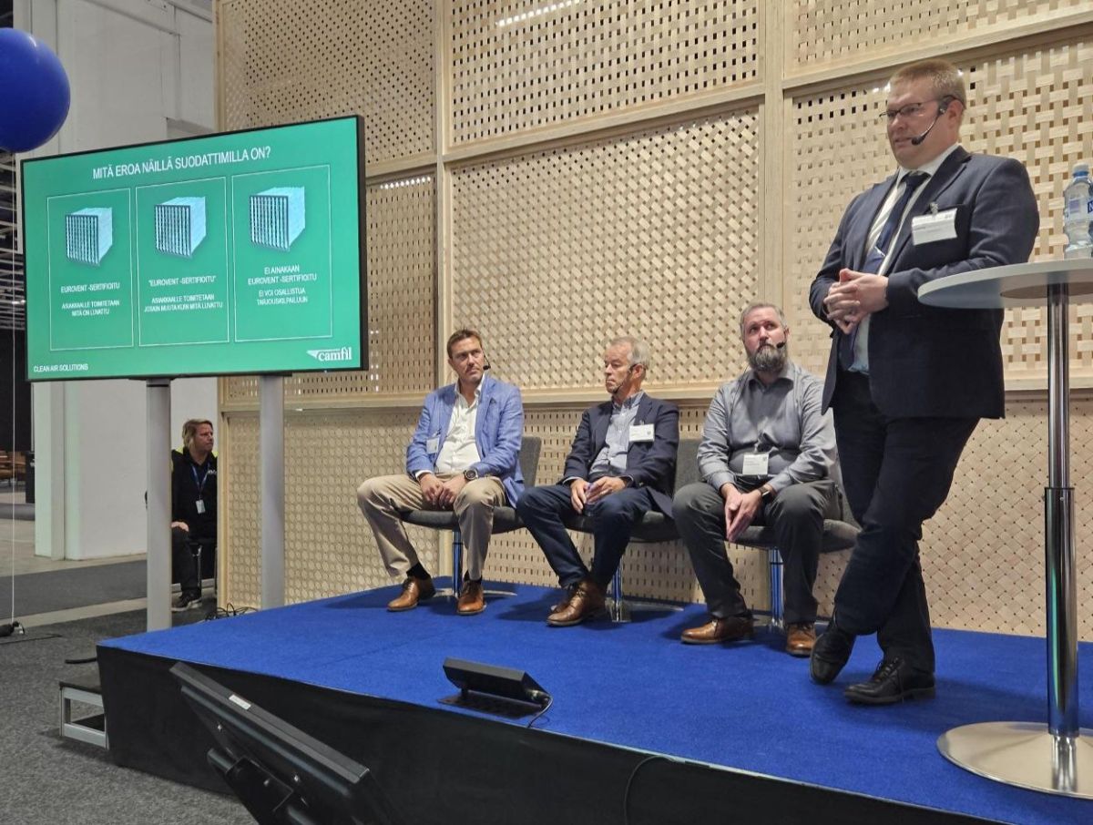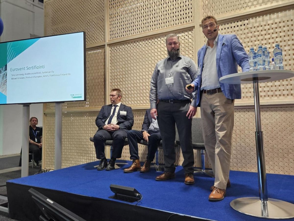 Au moment de la présentation, Timo Schreck, consultant pour Eurovent Certification, a été rejoint sur scène par les invités spéciaux Tony Lönnberg de Systemair, Mikael Virtanen de Flakt et Jukka Linjama de Camfil. Nous remercions Tony, Mikael et Jukka ainsi que tous ceux qui ont participé à la session.