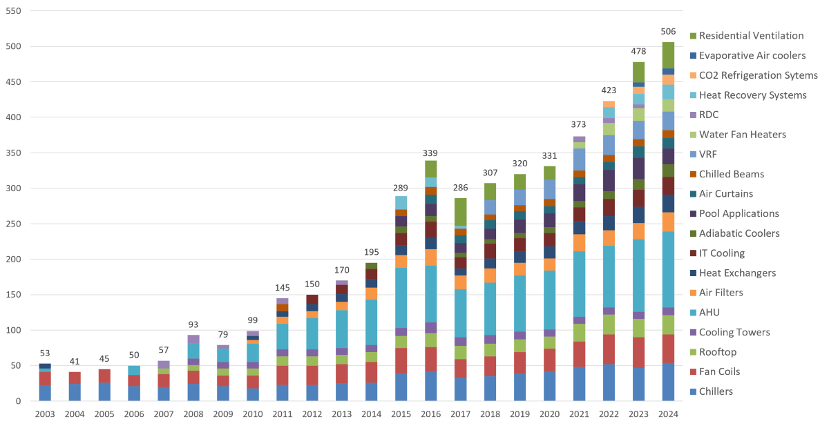 Yannick: Per quanto riguarda la raccolta dati, nel 2000 è stato lanciato il programma statistico sulle unità di trattamento dell'aria. Alcuni anni dopo, nel 2007, è stata lanciata la raccolta di statistiche sui tetti, con dati che risalgono al 2004. Dal 2008 in poi sono stati aggiunti nuovi programmi, tra cui Torri di raffreddamento, Scambiatori di calore, Filtri d'aria e Raffreddamento IT. Oggi abbiamo 19 programmi che coprono un'ampia gamma di prodotti HVACR.