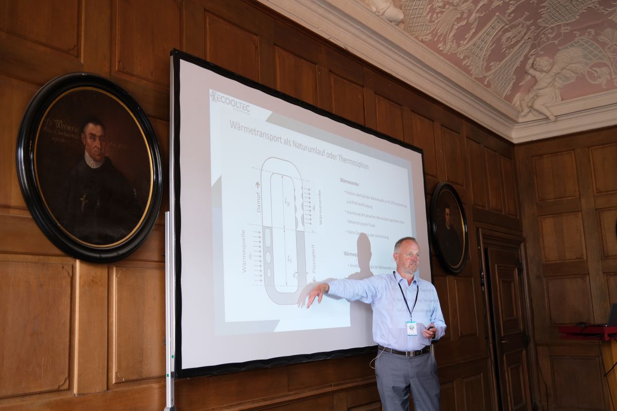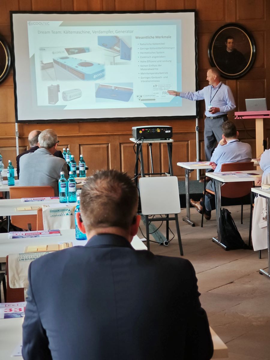 La terza presentazione del primo giorno al Kloster Eberbach è stata tenuta dal Dr.-Ing. Jürgen Süß, CTO di ECOOLTEC Grosskopf GmbH. Jürgen ha iniziato con una breve presentazione dell'azienda prima di entrare subito nella "discussione sull'eterno refrigerante" e sull'impatto della refrigerazione sul cambiamento climatico. È seguita una rapida spiegazione della catena del freddo alimentare, compresi i sistemi refrigerati con e senza gas fluorurati.