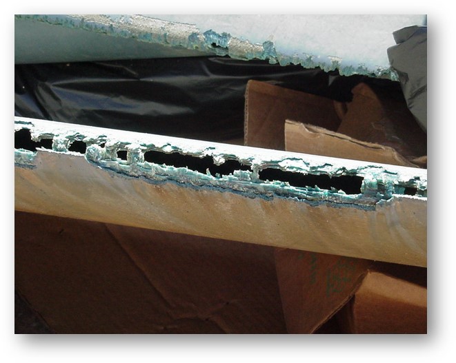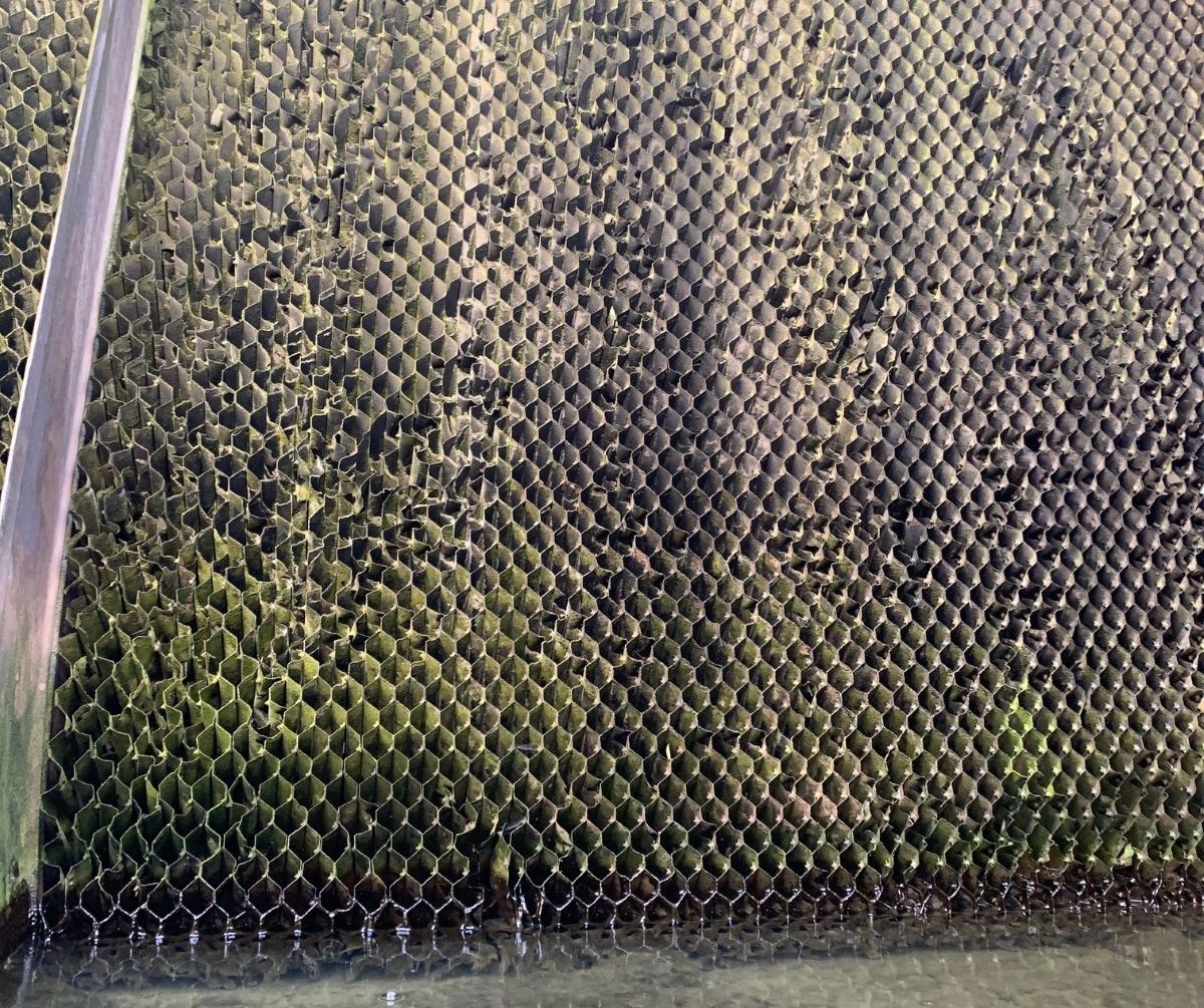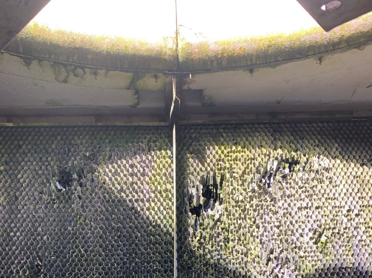 Le immagini precedenti mostrano una significativa erosione e corrosione all'interno di una torre di raffreddamento al di sopra dell'eliminatore di gocce, soprattutto quando è stato installato un eliminatore di gocce con un valore nominale molto basso o quando si sono verificati danni alla gocce.