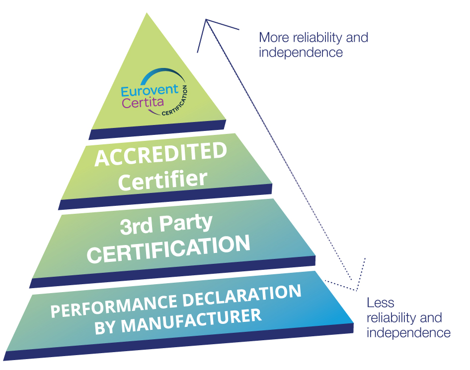Производители не обязаны проводить независимую проверку данных о производительности. Некоторые проводят самостоятельные испытания и самостоятельно заявляют о производительности. Другие могут использовать независимую лабораторию для испытания продукции. Кроме того, некоторые идут по пути сертификации продукции, выбирая более строгий подход, состоящий из стандартизированных независимых лабораторных испытаний, заводских аудитов, анализа данных и надзора за продукцией со стороны аккредитованного органа по сертификации, такого как Eurovent Certification.