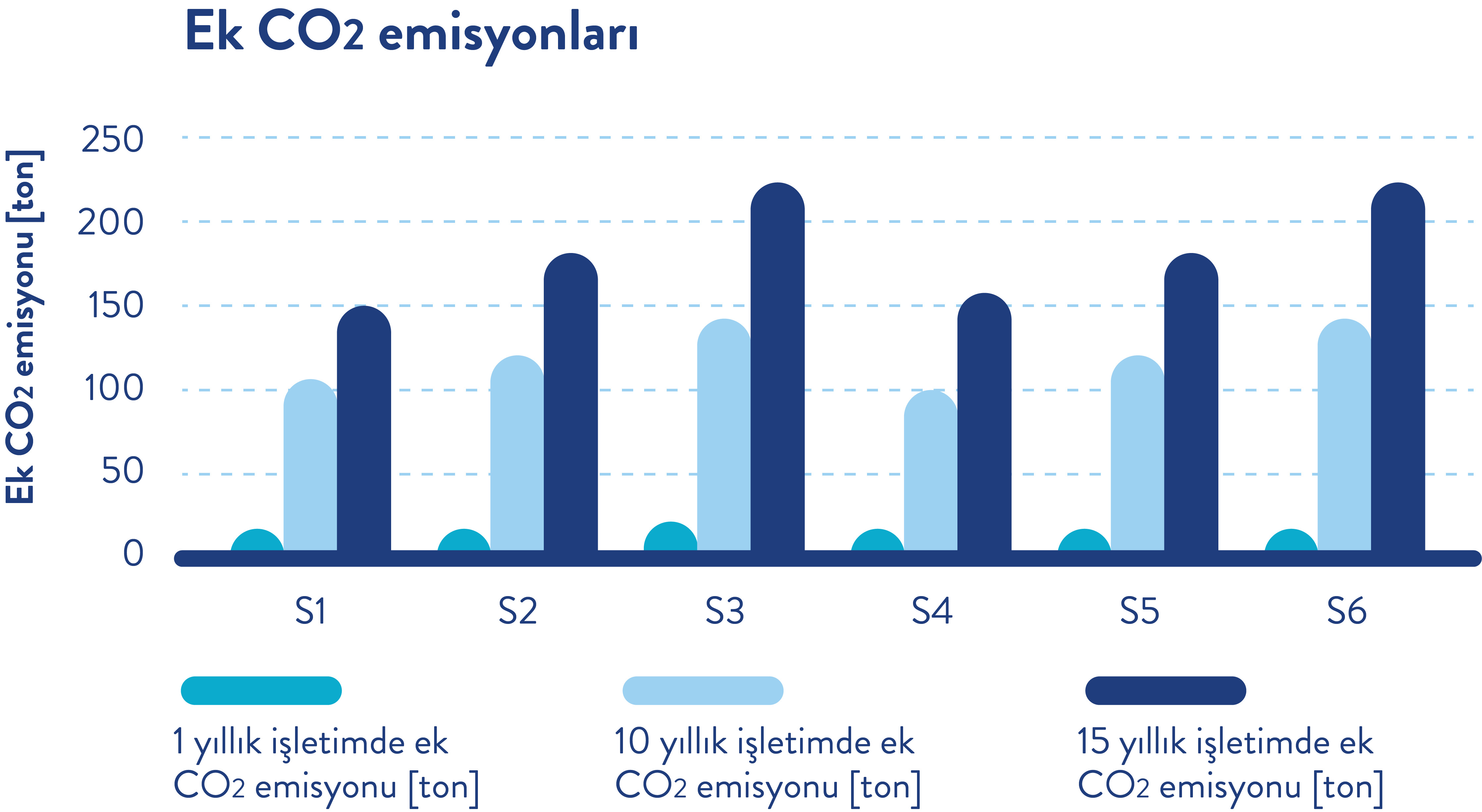 | Ek CO2 emisyonu [ton] | 14,9 | 148,5 | 222,8 |